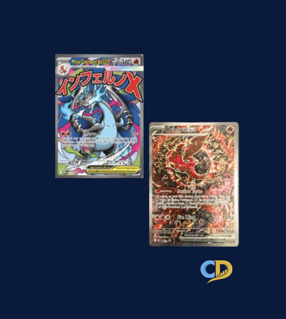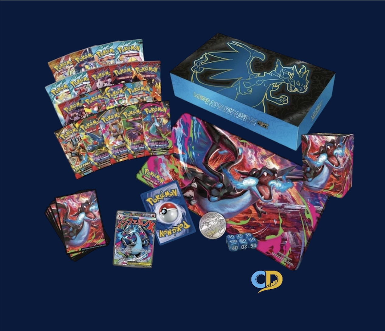 - In this Ultra-Premium Collection, you’ll find Mega Charizard X ex as a foil promo card, along with another foil promo card featuring Oricorio ex. It also contains 18 Pokémon TCG booster packs, 65 card sleeves featuring Mega Charizard X, 1 playmat featuring Mega Charizard X, 1 deck box featuring Mega Charizard X, 1 metal coin featuring Mega Charizard X, 6 damage-counter dice and a code card for Pokémon TCG Live.