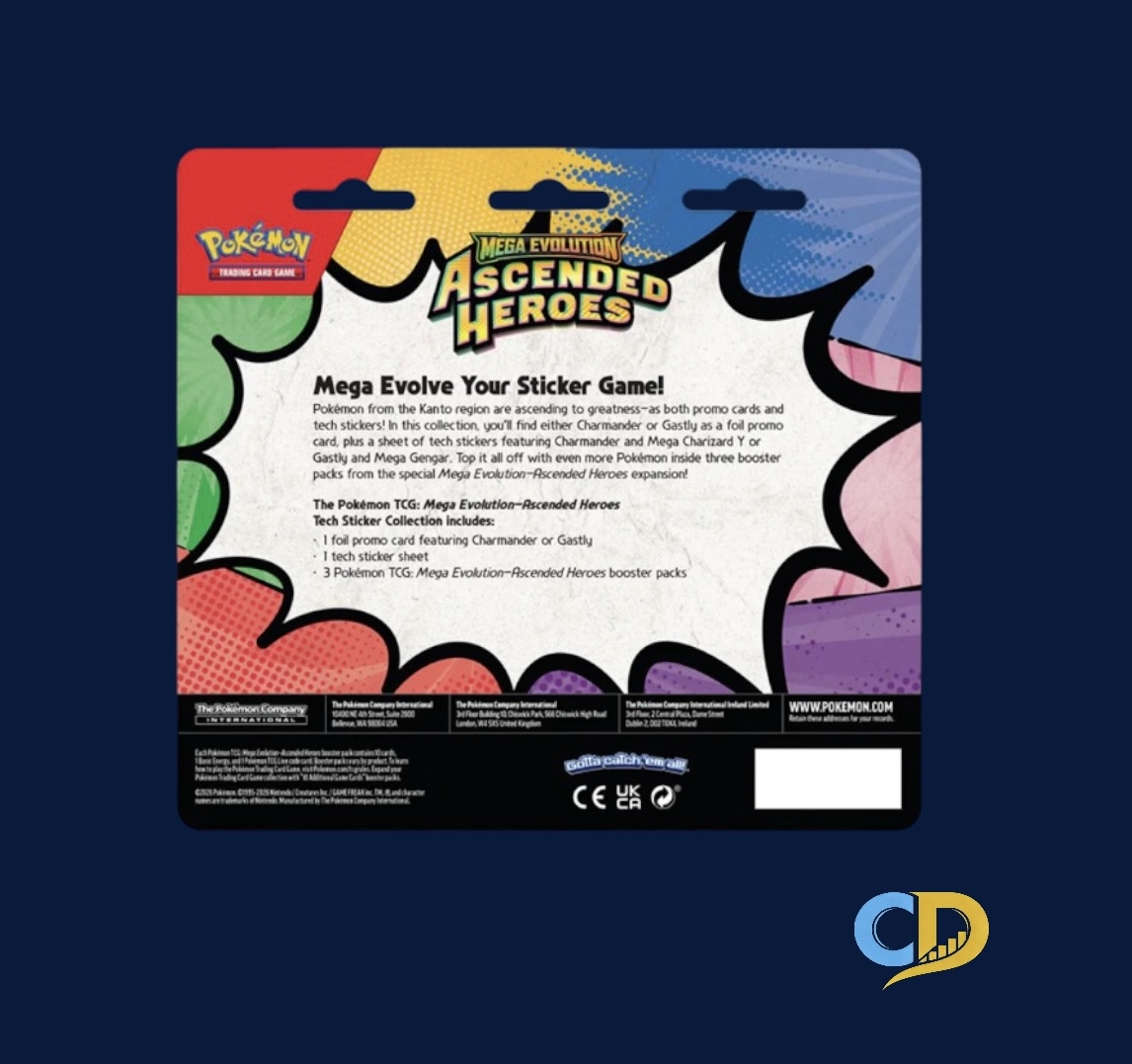 - Contains 3 Pokémon TCG: Mega Evolution—Ascended Heroes booster packs. (Each booster pack contains 10 game cards, 1 Basic Energy, and 1 Pokémon TCG Live code card. Cards vary by pack.) - You’ll also find 1 foil promo card featuring Charmander and 1 tech sticker sheet.