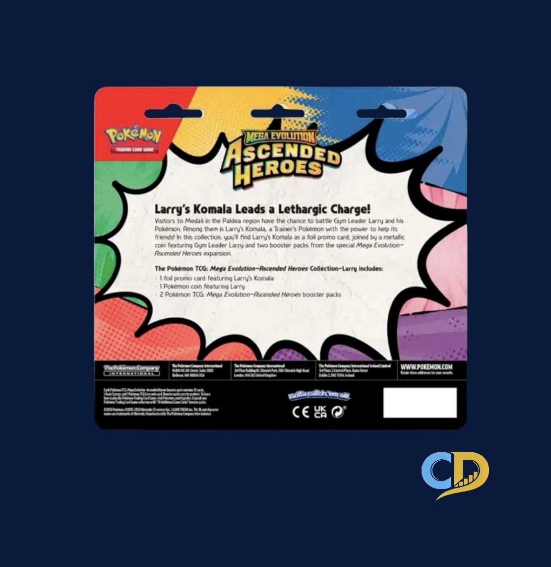 - Pokemon TCG Mega Evolution — Ascended Heroes 2-Pack Blister. Includes 2 booster packs, 1 foil promo card, and 1 Pokemon coin. Available in Larry's Komala and Erika's Tangela variants. Factory sealed.