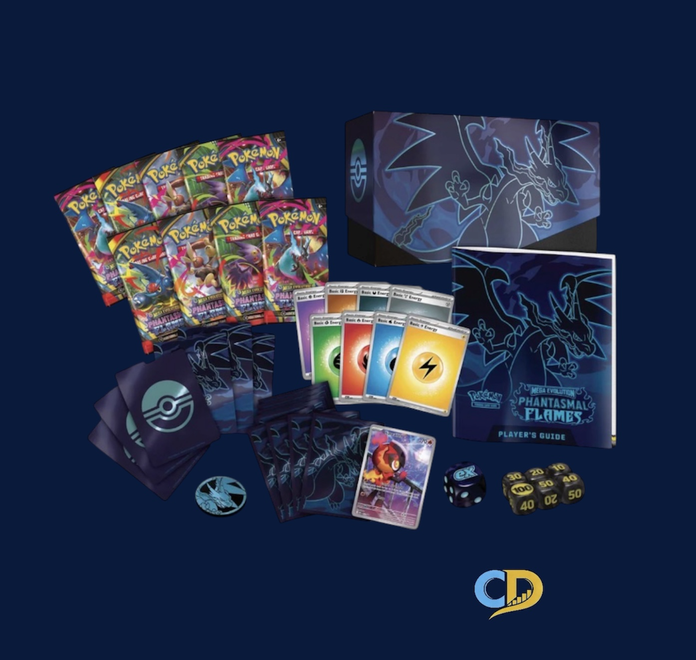 - You also get 40 Pokémon TCG Energy cards, 6 damage-counter dice, 65 card sleeves, and 1 competition-legal coin-flip dice. Includes a player’s guide to the Mega Evolution—Phantasmal Flames expansion; a collector’s box to hold everything, with 6 dividers to keep it organized; and a code card for Pokémon Trading Card Game Live.