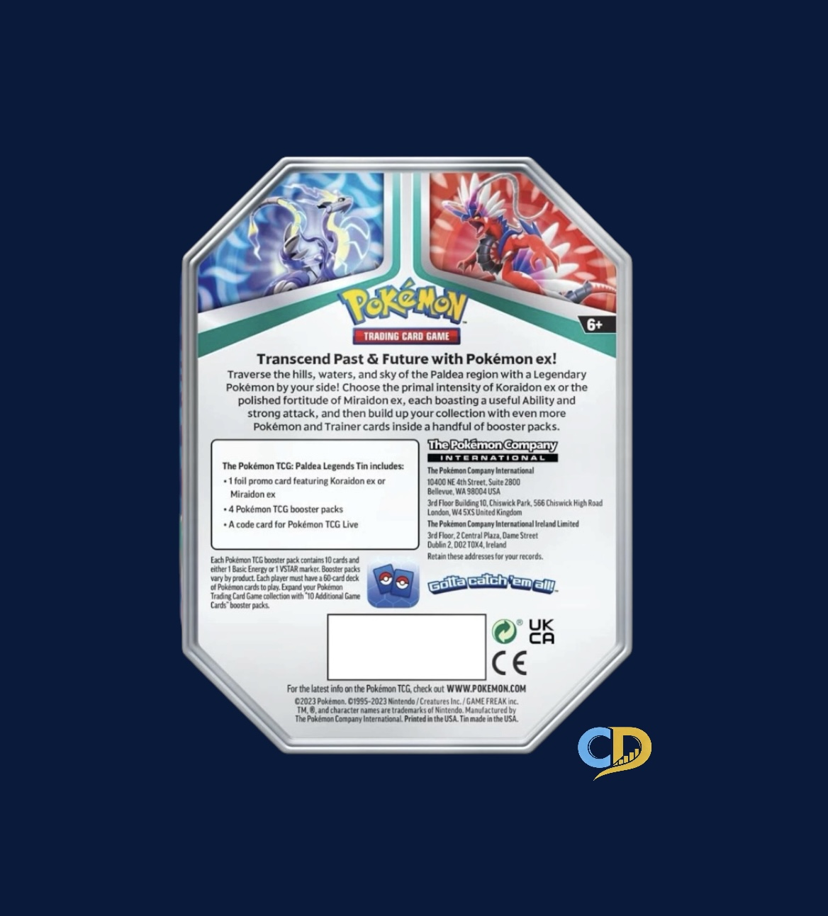 - The beautifully designed Paldea legends Tin features a stunning illustration and includes 1 foil promo card featuring Miraidon ex